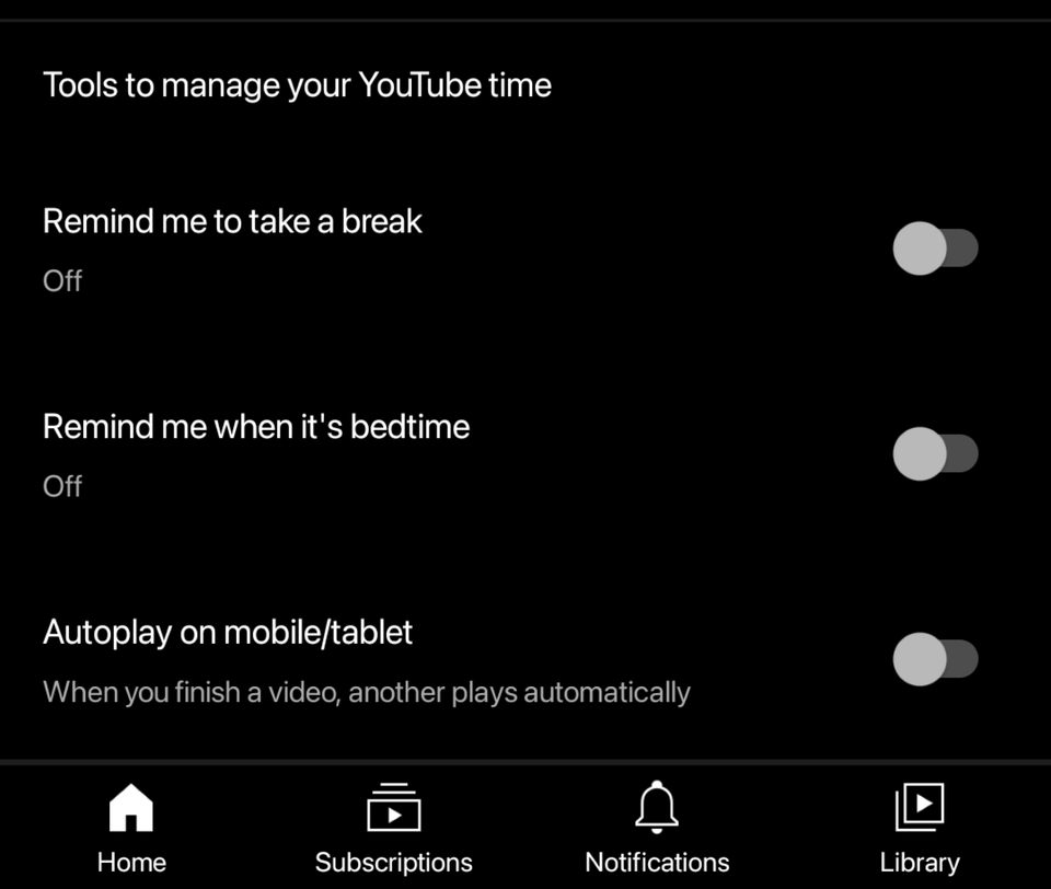 The YouTube mobile app includes tools to manage time spent on the app. Even though the platform encourages the user to spend more time, these reminders help balance the user’s experience and avoid burnout.