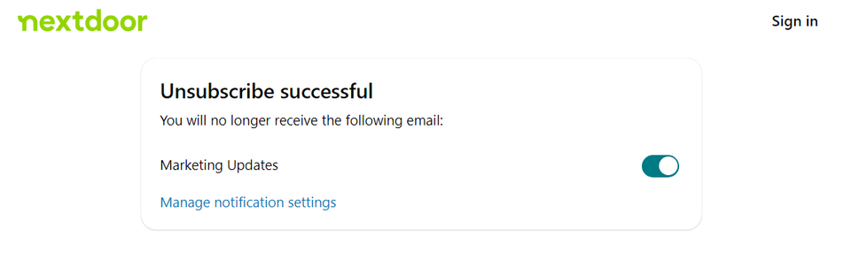 Nextdoor’s unsubscribe panel has an ambiguous switch button.