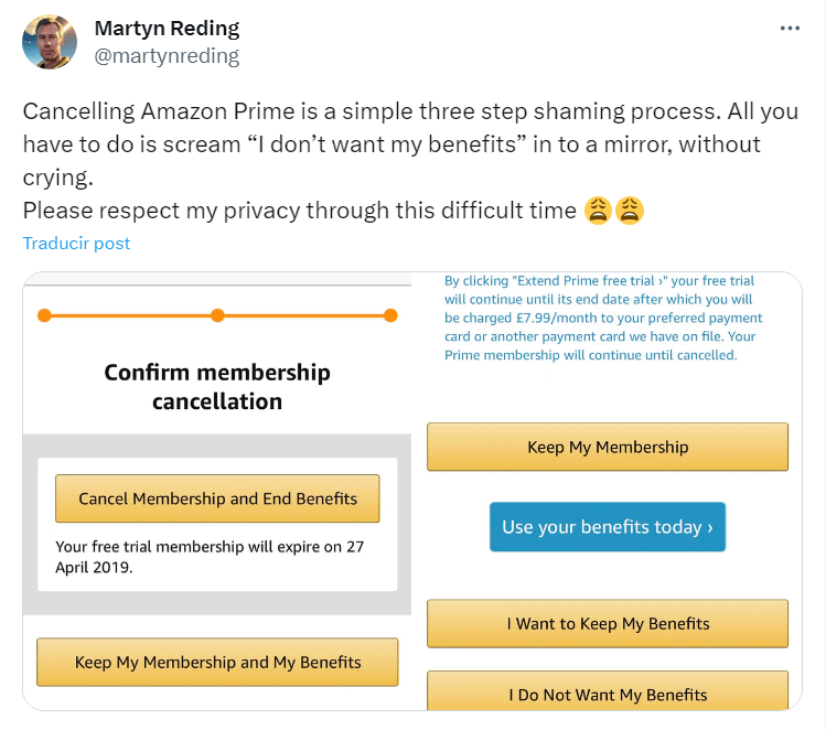 Amazon Prime puts endless barriers to canceling a membership. Source: Martyn Reding / Twitter