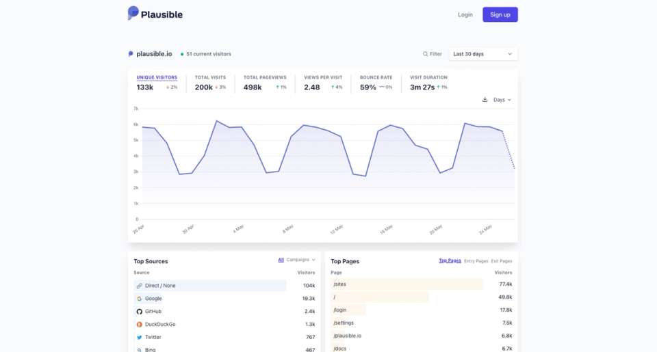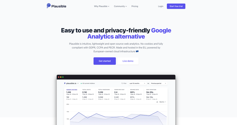 Plausible, as its name indicates, is plausible. It is currently the most popular privacy-focused web analytics tool that provides essential insights into website visitor behavior without compromising user privacy. It aims to offer a more straightforward and transparent alternative to traditional analytics platforms. Its privacy-focused approach prioritizes user privacy by collecting only essential data to generate accurate website analytics. It avoids cookies and does not track personally identifiable information (PII). It respects visitors' privacy choices, such as honoring Do Not Track (DNT) preferences. Plausible can synchronize with Google Search Console, enabling you to identify the search keywords that generate traffic to your website.