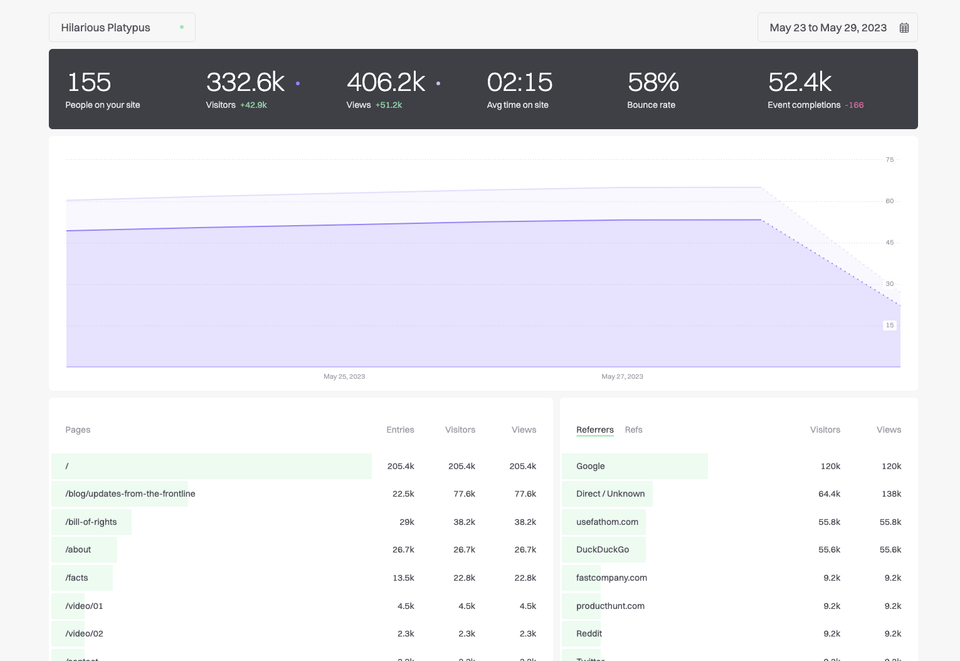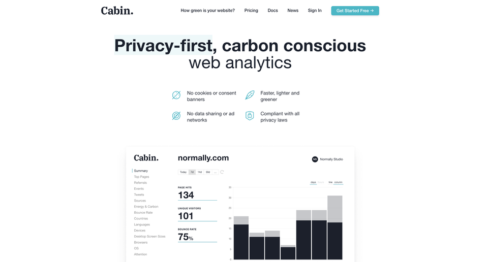 Cabin is a privacy-first, carbon-conscious web analytics solution. It's lightweight and compliant with all known privacy laws. It doesn't store visitors' unique identifiers or personal data and also doesn't sell or pass it to anyone. It is a tool also focused on reducing energy and always looking for ways to save energy. Their owners run four small servers which use custom software to be highly CPU and memory friendly, so they can leverage low-resource, low-energy servers while maintaining a high traffic throughput. It provides its users minimalistic, straightforward, and clear dashboard that shows the most critical metrics for its users.