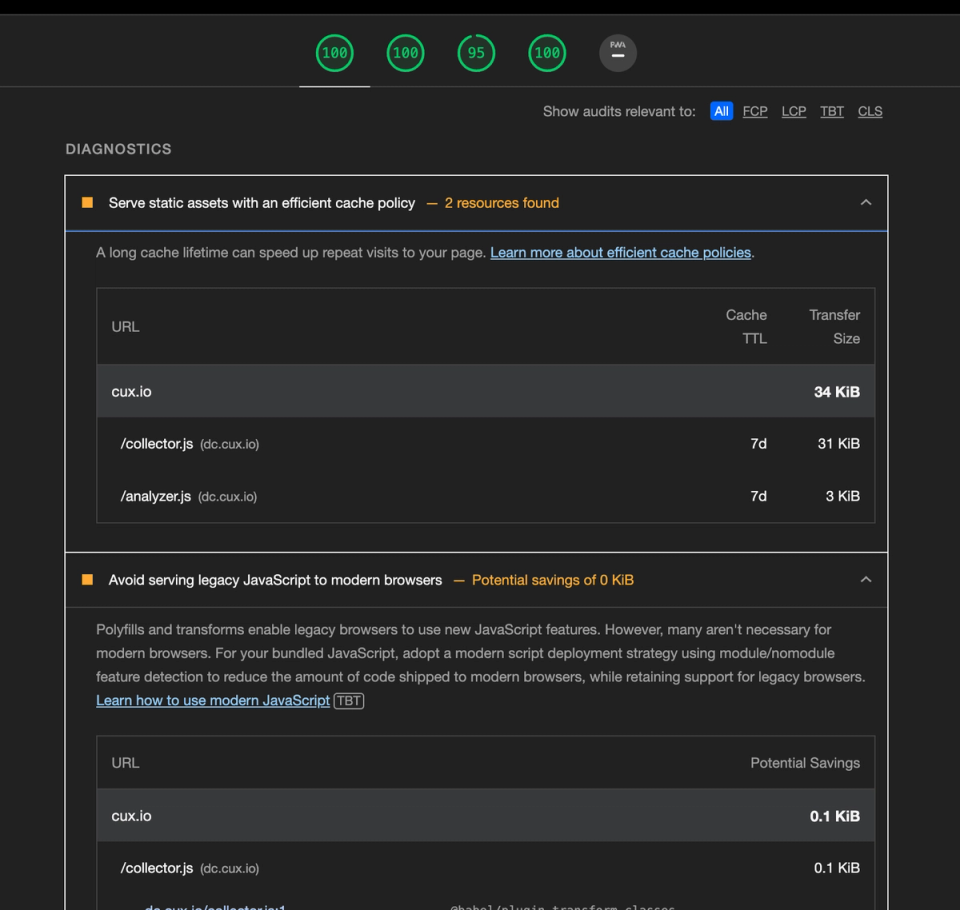 Piwik Pro | 103kb | 496kb | Performance: Drops to 95, Accessibility: Drops to 90 |