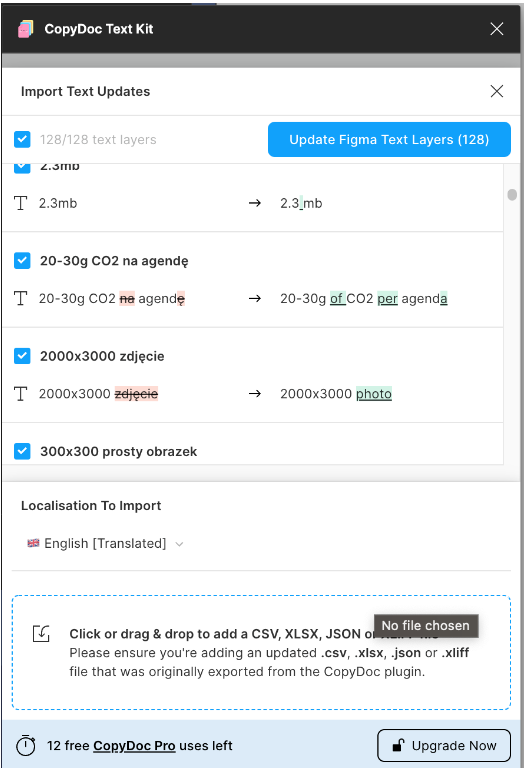Once I received the translated file, I went back to Figma and selected "Re-import text updated Figma". The pop-up opened immediately with all changes provided by Jula. I briefly checked if everything looked okay and clicked "Update Figma text layers". It uploaded all text layers in a flash.