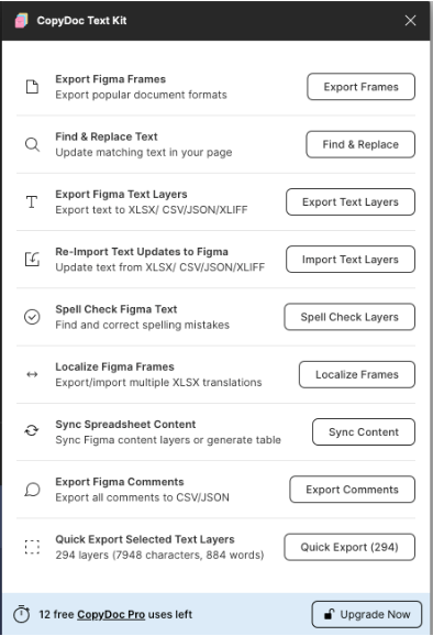 The Figma Community develops many interesting plug-ins that improve the Designer <-> Writer/Editor/Translator workflow. CopyDoc is the plug-in that solves many problems, for instance quick and organized export of text layer and smooth import back to Figma.