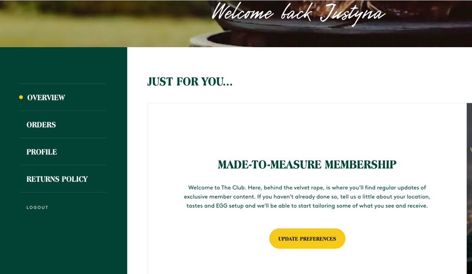 Example of personalization and exclusiveness on the Big Green Egg customer portal.