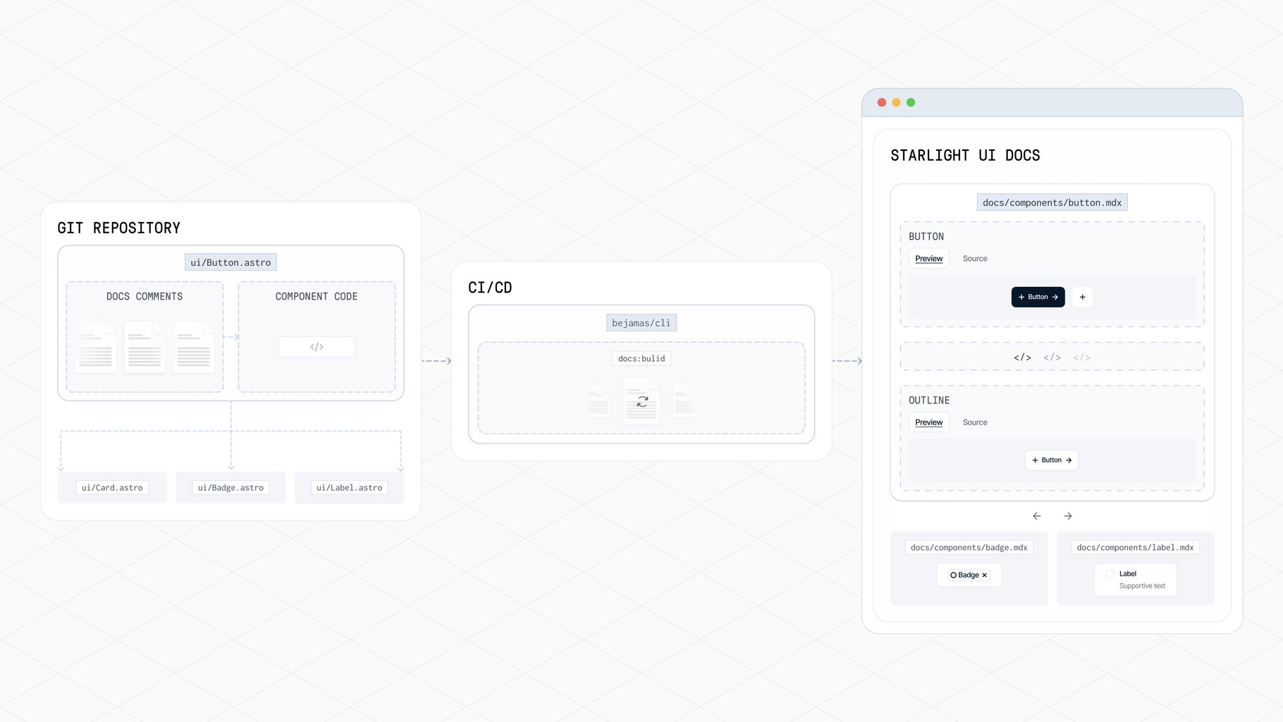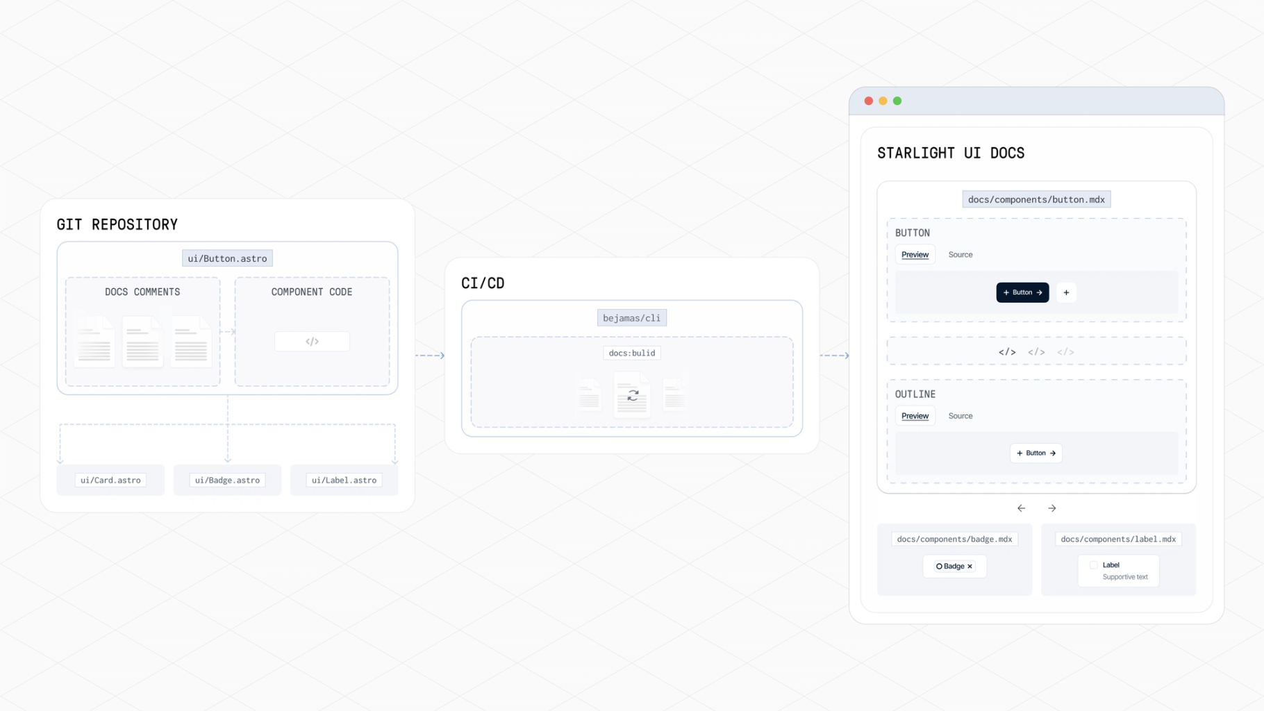 Documentation stays close to the source. Structured comment blocks inside each component are parsed by the CLI to generate MDX pages for Astro Starlight. That keeps the docs synchronized, clean, and easy to maintain without Storybook, React, or extra runtime layers.