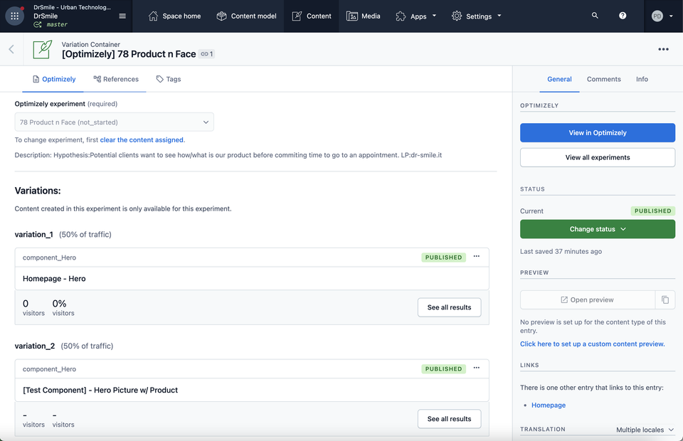 Now comes the time to improve the Editor Experience. Here's what we're working with: DrSmile uses Contentful as their headless CMS, and Optimizely has a plugin that connects to Contentful.