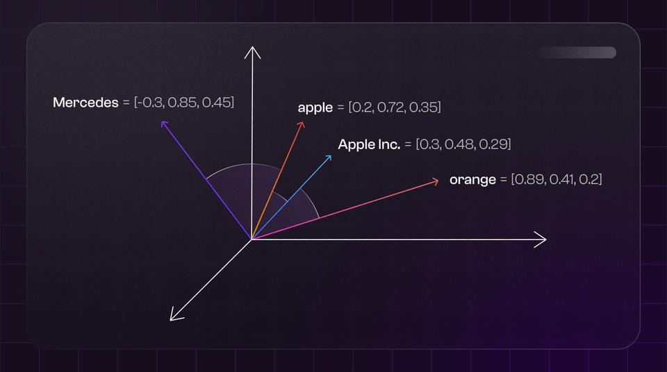 Imagine every word or phrase as a unique point in an expansive galaxy. In this space, points that share similar meanings are positioned closer to each other. For example, in our metaphorical galaxy, 'apple' (the fruit) and 'orange' are neighboring points, illustrating their shared context as fruits.