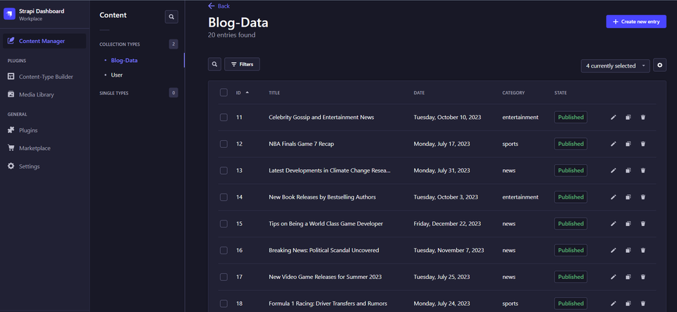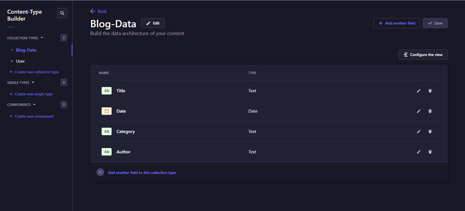 After inputting the required details, navigate the UI and open the Content-Type Builder page. For this article, this pagination component would contain four data fields – article title, date published, category, and author’s username. To create these fields, click on the create new collection type, and fill in the data types accordingly.