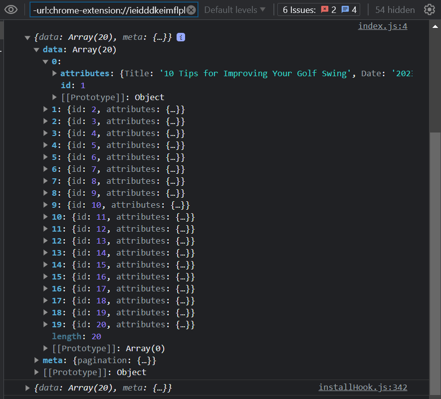 }Taking a look at the console, you can see all the data fetched from our Strapi backend.