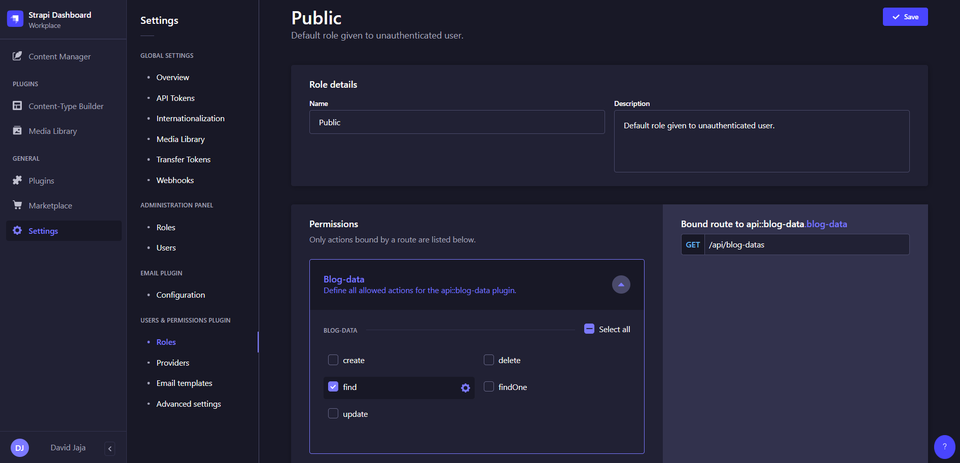 Finally, navigate to settings, roles (Users and Permissions Plugin), public and enable find in your collection. This allows fetching data from this endpoint without getting a forbidden error.