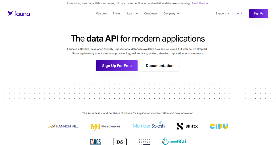 Fauna lets you start for free (with 100k read ops, 50k write ops, 500k compute ops and 100 MB storage) and pay as you grow.