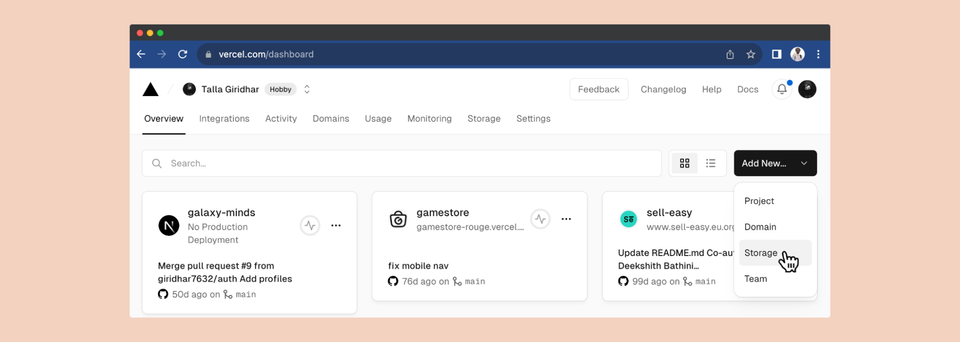 We'll store our messages in a serverless PostgreSQL database provided by Vercel. Go to the Vercel dashboard and log in to your account (I recommend logging-in using GitHub). Once you're in, click "Add new" and choose "Storage."