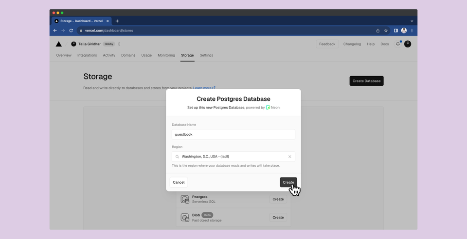 Click the "Create" button next to the "Postgres - serverless SQL" option. Fill in the details and choose a region near your users. This helps a little in reducing latency.
