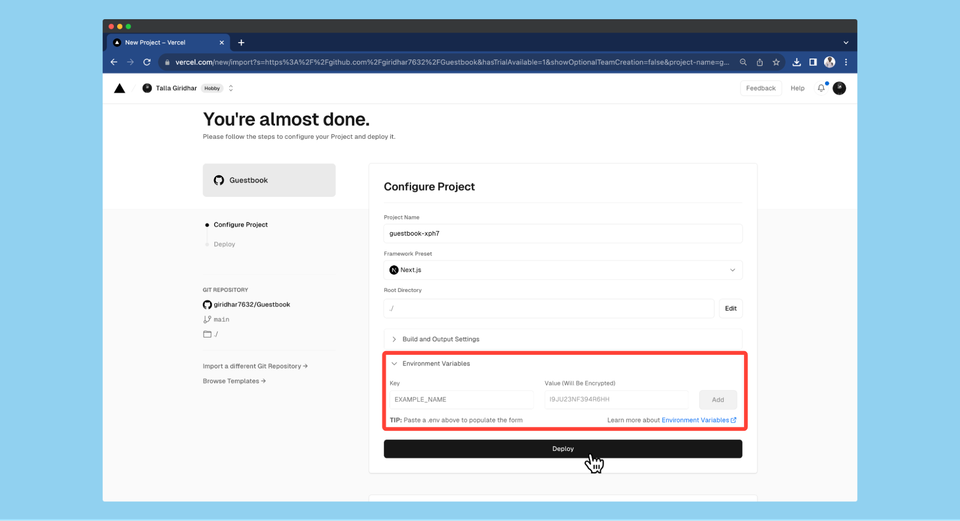 "Import" the project from the list and paste the contents of your .env file in the "Environment variables" tab. Finally, click on "Deploy" to see your app live in a few minutes.