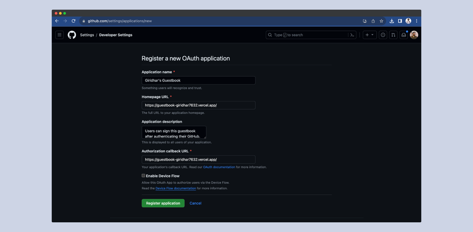 Go to the developer settings, and create a new OAuth app to use for authentication.