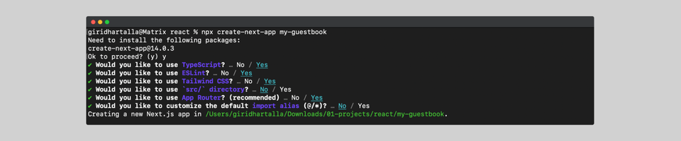 You can easily create a new Next.js app by typing the npx create-next-app my-guestbook command in your terminal. Don't worry if the questions seem confusing - just keep hitting Enter.