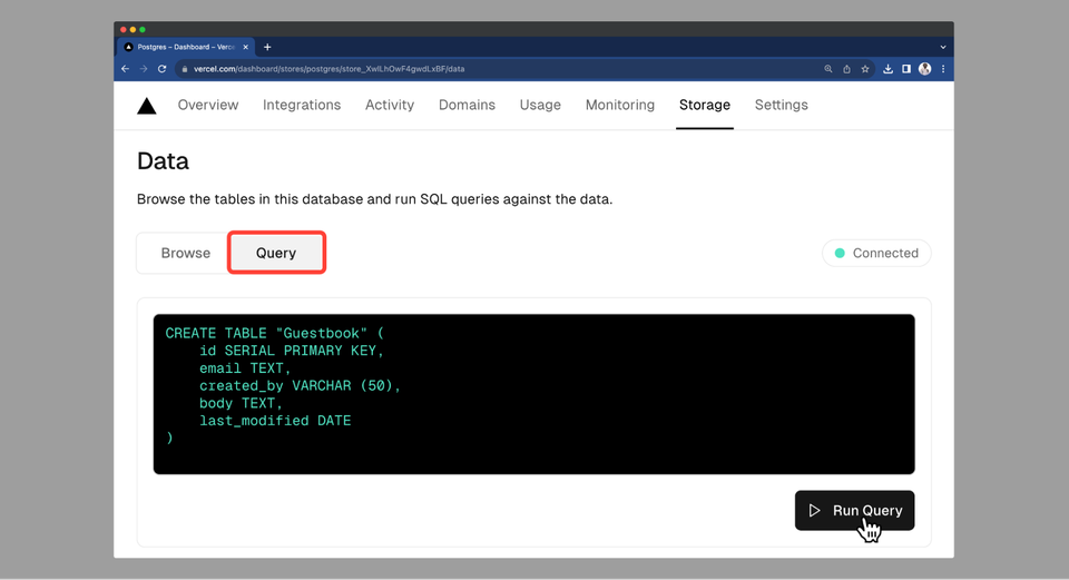 Once we have our database up and running, let's build a table for keeping track of all the guest entries. You can run the SQL statements right here in the "Query" section under "Data". To keep things simple, we'll use a few essential fields. Type the SQL statement below into the editor and click "Run Query" to make the table.