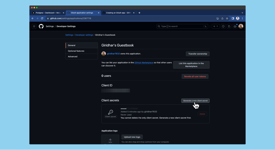 Click "Generate new client secret" to generate a new client secret which you can use to connect your app using Next-auth.