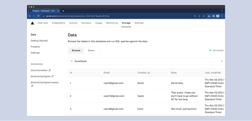 Run npm run dev to start the server and log in with your GitHub. Then, add some entries using the form. You'll find them in the "Browse" tab under the "Data" section in the Vercel dashboard.