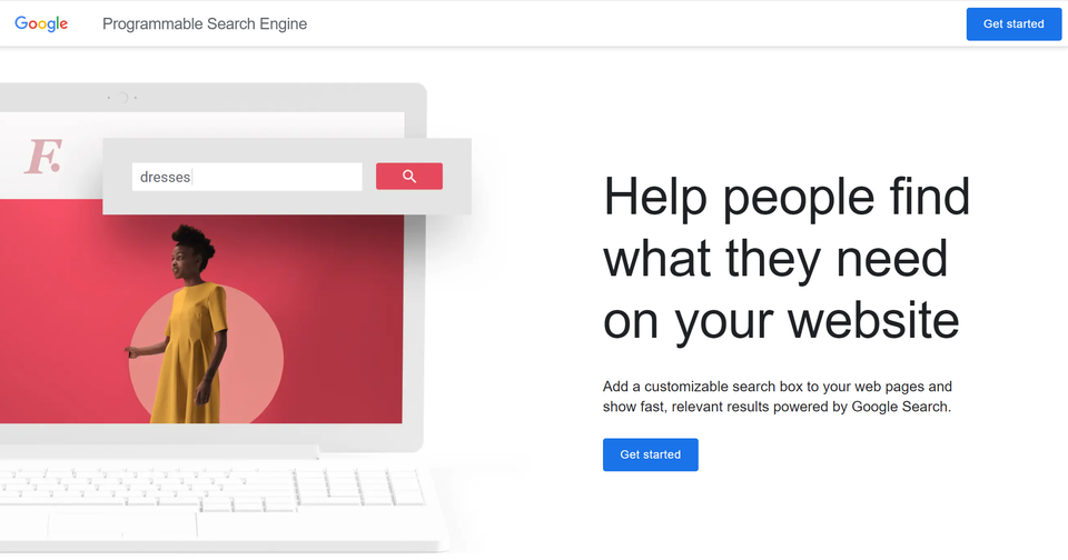 Google’s Programmable Search Engine (previously known as Google Custom Search) is a Google solution for website search functionality. It offers a customizable search box for your website that shows relevant results powered by Google Search.