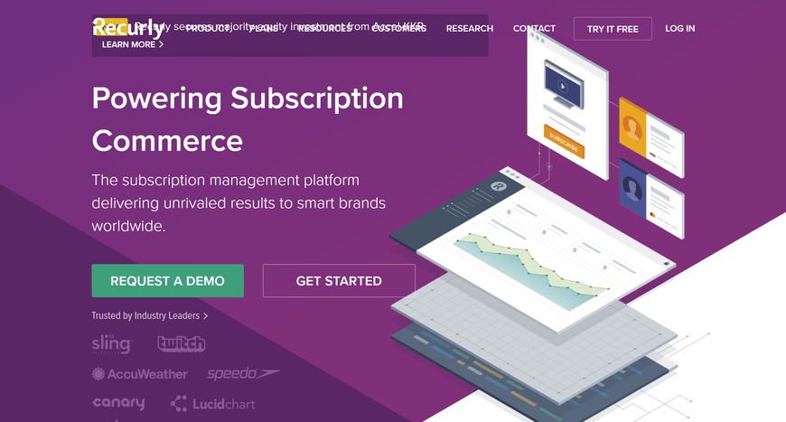 Recurly is another subscription commerce platform used by big brands such as AccuWeather, Asana, PipeDrive, Lucid Chart, and Unbounce.