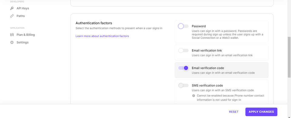 With that, passwordless authentication is set. Next, it is mandatory to select at least one of the other options in the Authentication factors section. You can choose to allow authentication by email verification link or code and SMS verification code, but it mandates choosing at least one.