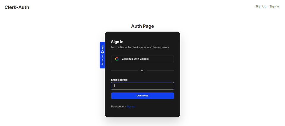 };With that done, the entire application is now protected, and all attempts to access it redirect to Clerk's default authentication page.