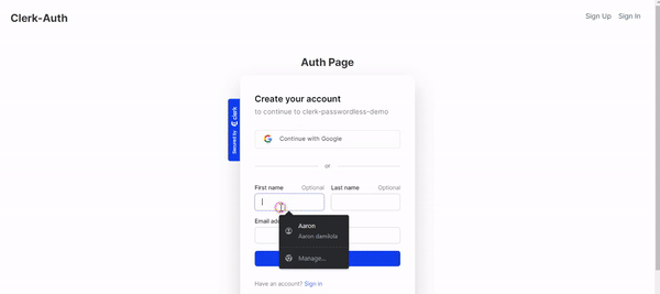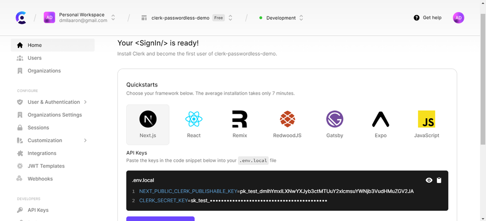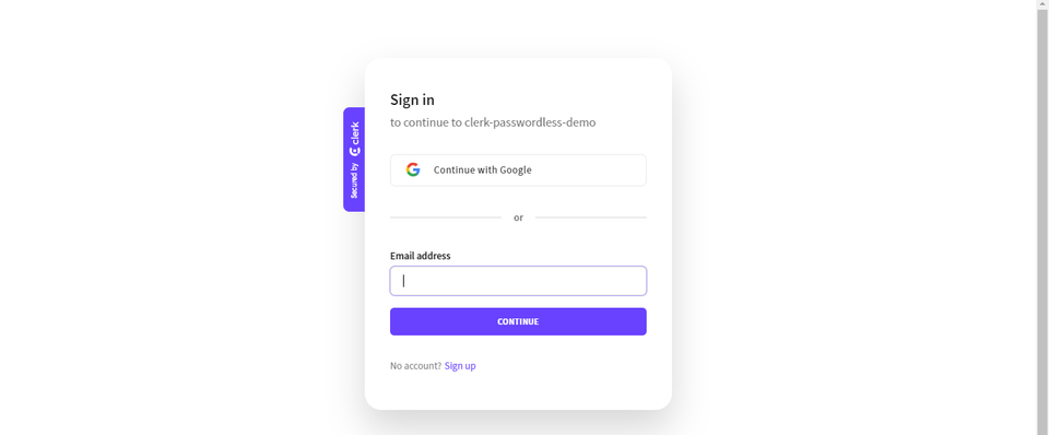 cd clerk-passwordless-demoAnd start the development server with the command below.