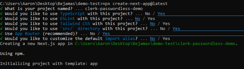 On successful installation, the tool creates a new project folder that has nested in it the default folder structure and files. Here, we name the project clerk-passwordless-demo.