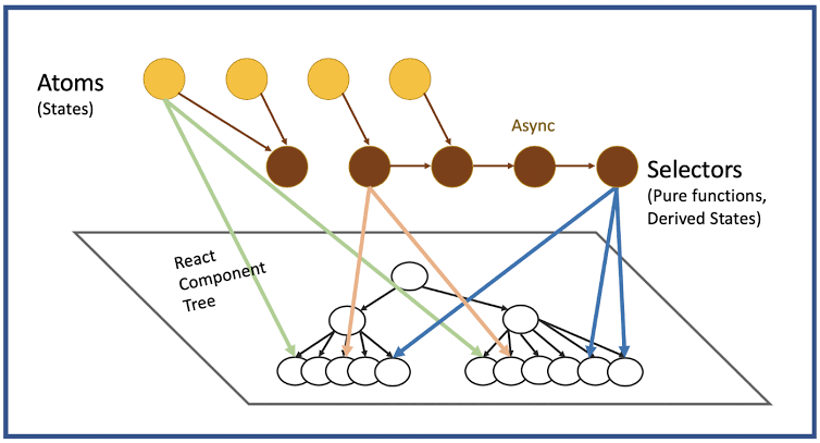 The image above illustrates how atoms and selectors are linked in Recoil. This interconnection between atoms and selectors allows the modification of states set in atoms by selectors linked to React components