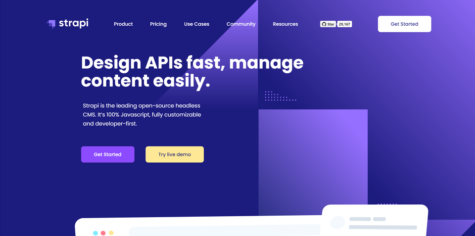 Strapi is great if you want to start a new CMS project in no more than two minutes. During the development stage, Strapi will set up an SQLite connection so you won't need to boot up a MongoDB or MySQL just for the development process.