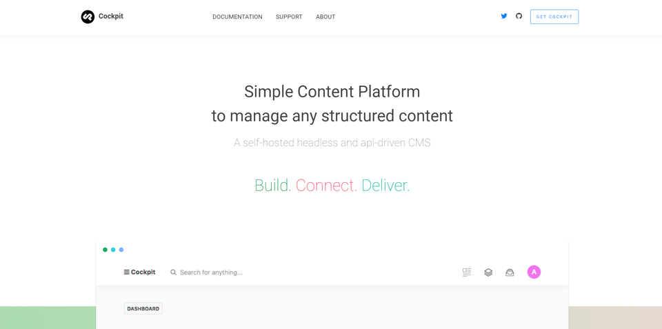 Cockpit is a self-hosted, open-sourced headless, API-driven CMS. In all honesty, we rarely had it on our radar (probably because it is loved mostly by VueJS devs). Joking aside it seems to be perfect when in need of a flexible content structure but don't want to be limited in how to use the content. So, no predefined content models but the ones you make yourself.