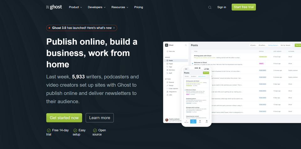 Ghost is an open-source blogging platform. The complexity of WordPress that turned it into the CMS we know today infuriated people within the WP team that wanted a clean, fast, and easy-to-use blogging platform and not a content management system for pretty much anything. So, they made Ghost.