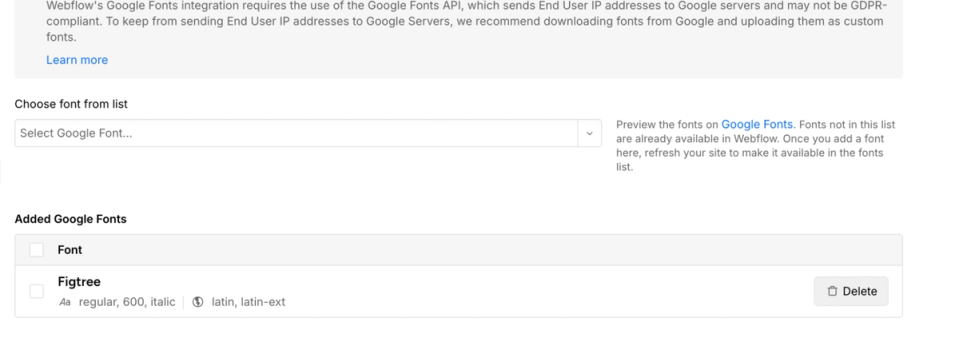 What to do: Download your font files from Google Fonts or your provider. Then upload them to Webflow via Project Settings → Fonts.