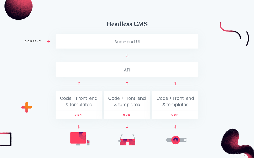 Headless CMS, as we already pointed out, decouples content management from the presentation layer. This means that your content management functionalities (like creation, management, and how digital content is stored) are separate from your front end allowing you to deliver content beyond websites and apps. It allows you to repurpose your content from multiple front-ends making them a perfect fit for composable builds.