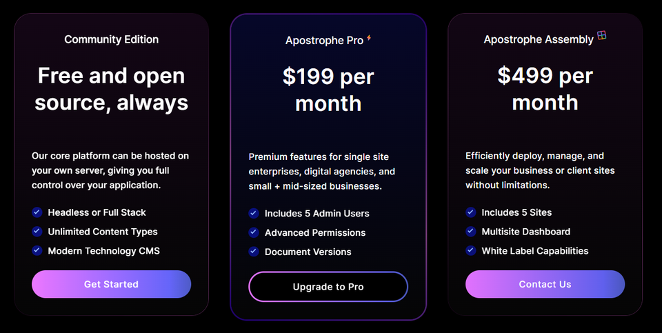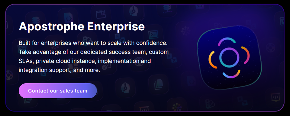 As you can notice, the offer includes a starter, intermediate, and advanced plan. This way, they can cover individual developers, small and mid-sized businesses, and large companies. For the corporate sector, there is Apostrophe Enterprise, a tailored solution for enterprises that want to scale with confidence.