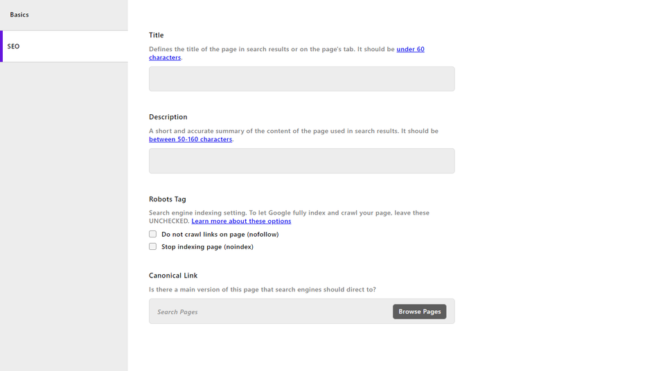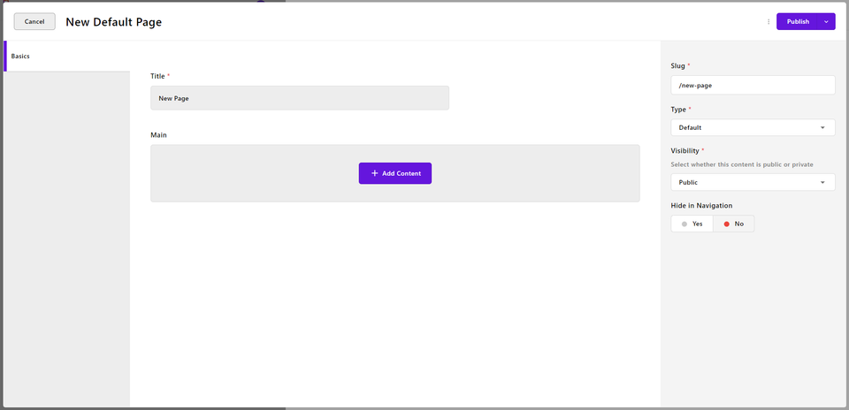 Thanks to this section, initializing a new page only takes a few clicks. By enabling the @apostrophecms/seo module, you can also add SEO capabilities to the page definition editor.