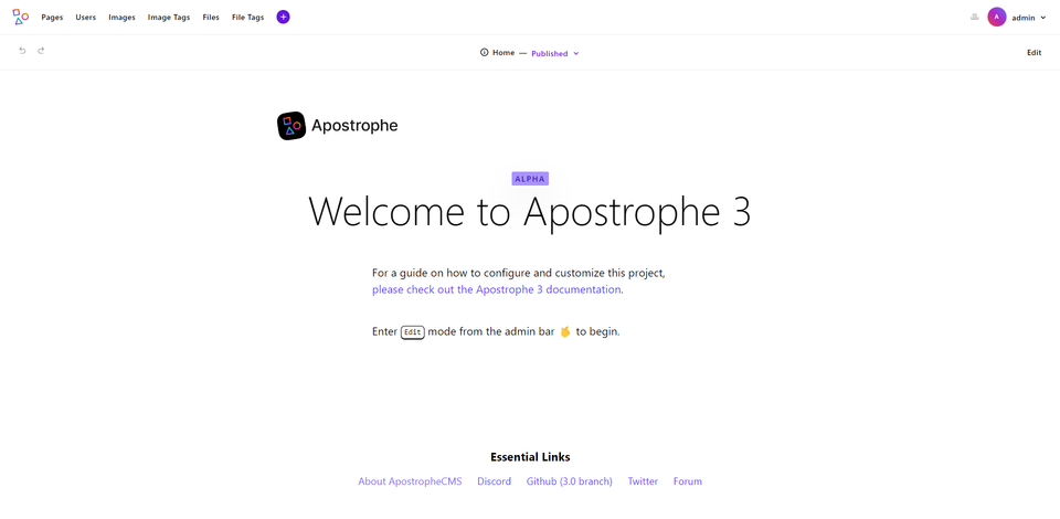 The default dashboard shows the home page of a sample site that includes some useful links to the docs explaining how to use the tool. From the menu in the upper left corner, you can reach the sections for creating new pages, managing files, handling user permissions, and organizing images. With the "Edit" button in the top right, you can activate the in-context editing feature on the current page. As you can see, the UI is pretty minimalist.