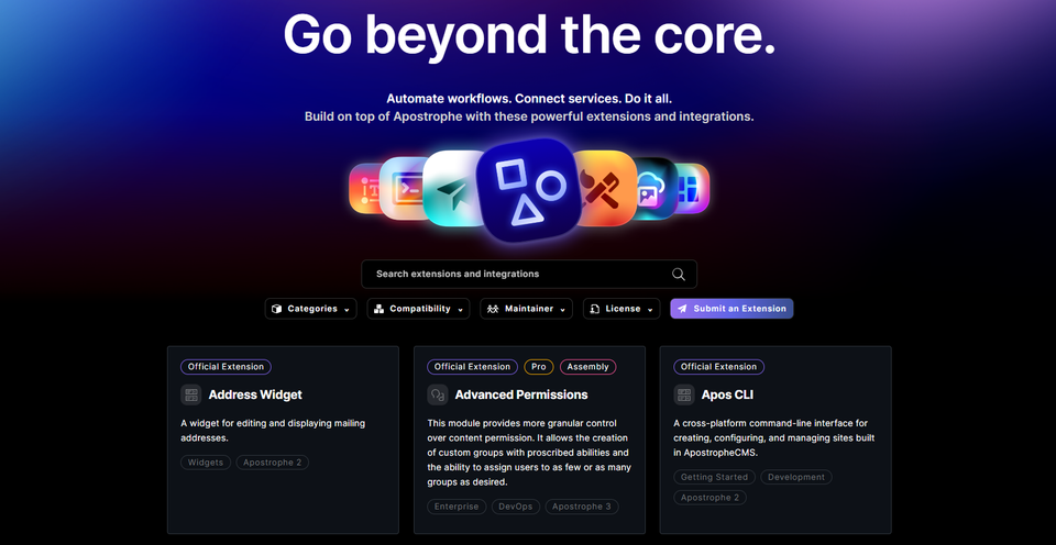 You can explore all extensions in the Apostrophe Extension Marketplace.