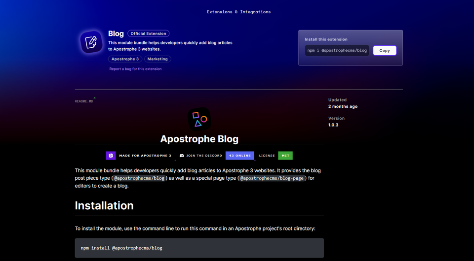 Each extension has a dedicated page where you get the links to the GitHub and NPM pages, see the latest release date, and read the step-by-step instructions to install it and integrate it into your Apostrophe project.