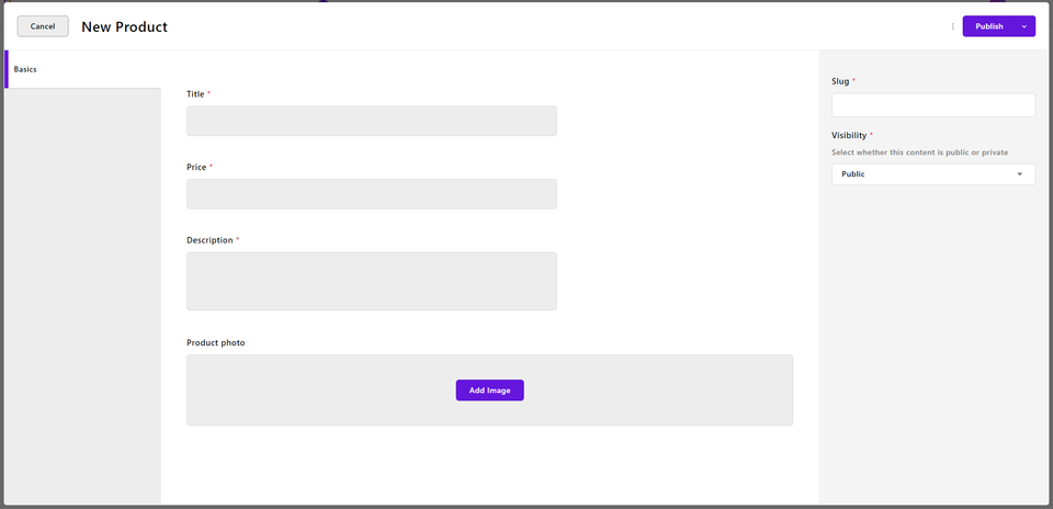 The data input elements will change based on the fields your piece type consists of. By default, Apostrophe offers 22 field types. You can customize the existing input elements, introduce new custom field types with corresponding content management UI components, and specify data validation rules for your fields.