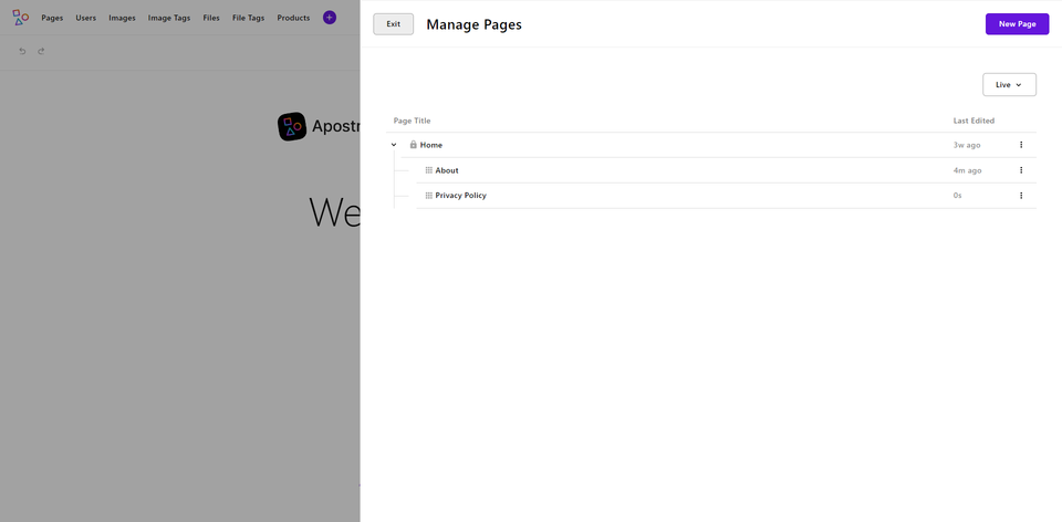 Keep in mind that Apostrophe relies on a drafting system. When you create a page, it does not get published immediately. It is the responsibility of editors to choose whether and when to publish content.