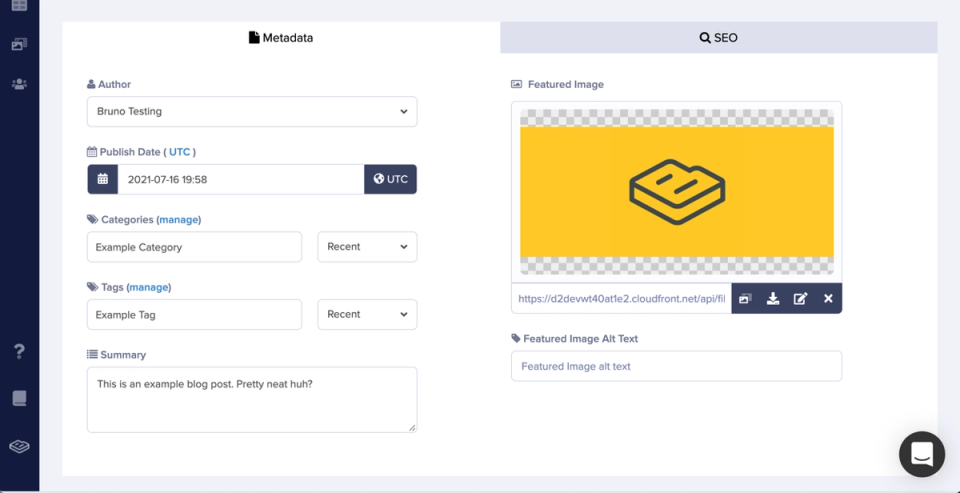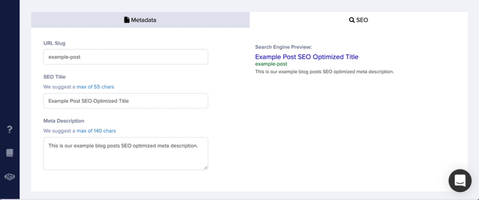 The blog engine also comes with two additional tabs that will help you with your SEO efforts. The first tab is for you to cover the metadata fields, and the second one is to cover the essential SEO Tags (that your page can't live without).