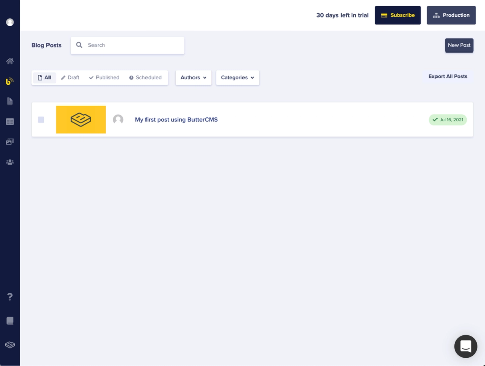 Butter has a comfortable, clean, and intuitive interface. All menu options are accessible in the sidebar on the left side, which includes dashboard, blog posts, pages, collections, media library, users, and useful links like their knowledge base and docs.