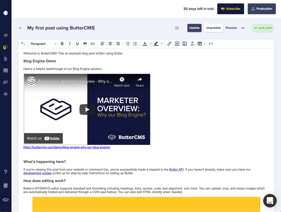 API-based CMS and blogging engine for rapidly building websites in any programming language. Great for blogs, dynamic pages, and more. Understanding the pain points of WordPress all too well is what sparked Jake Lumetta, the founder and CEO, to develop ButterCMS.