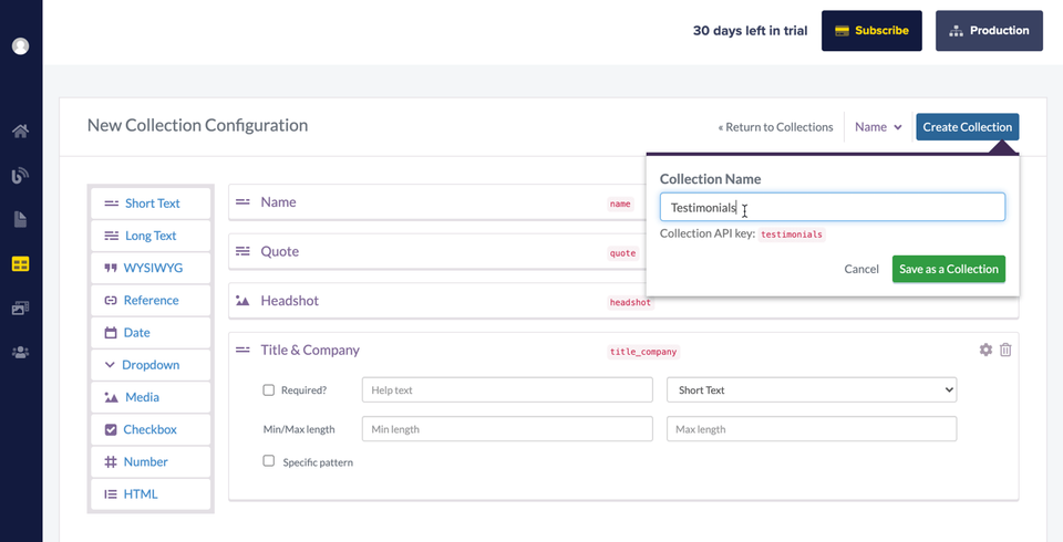 Field Types Different types of data fields available for content, such as text, number, date, media, etc. | ||