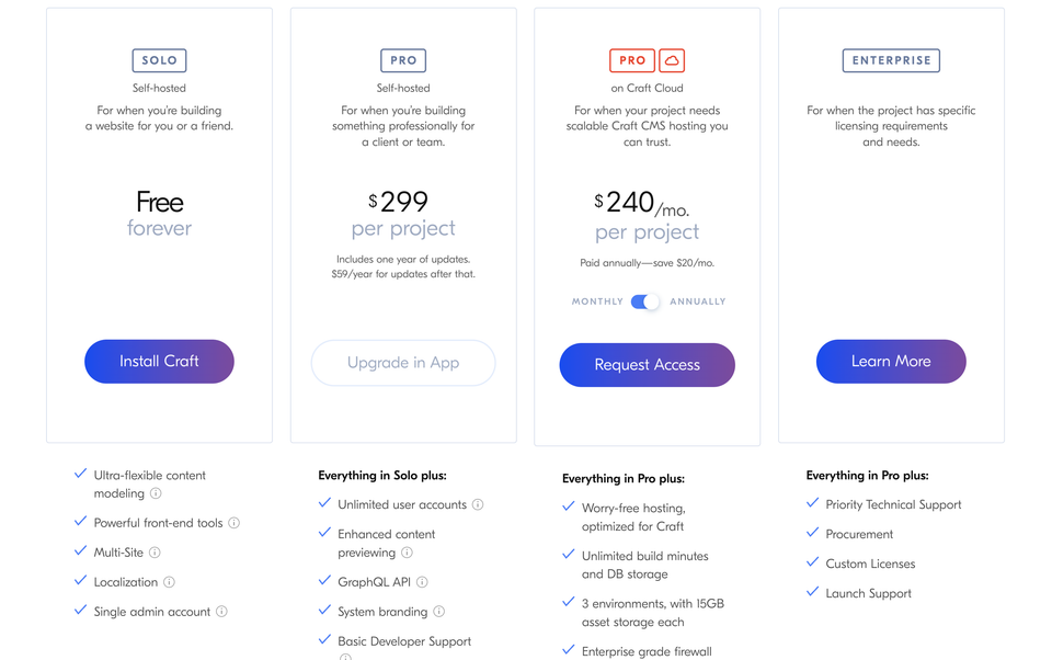 You do not need to worry about purchasing the license in case you want to use the Craft CMS for personal use or for those of your friends. However, having a free tier means that you don’t have access to GraphQL API, more admin accounts than 1, enhanced content previewing (previewing from multiple targets, e.g. SPA) developer-to-developer support, and personalized CMS branding. All of that is available for 299$ per project per year with updates included for that year (+59$ for updates afterward).