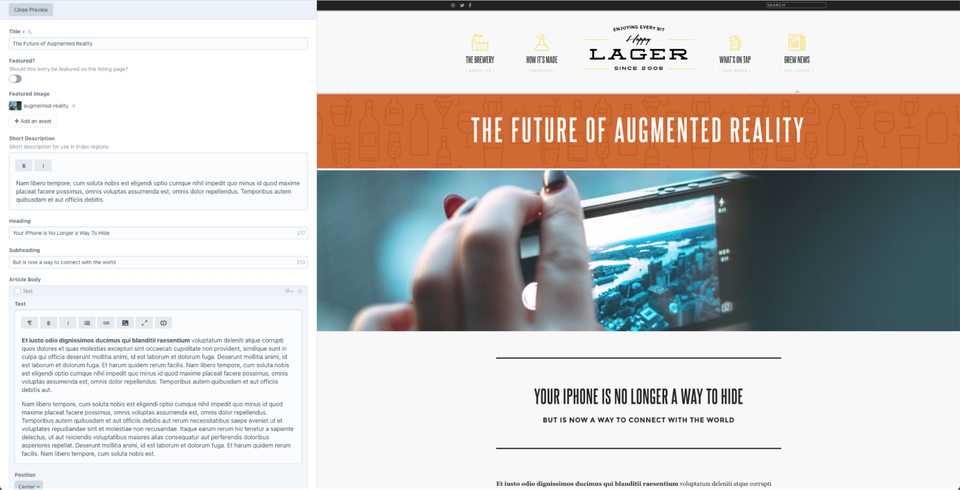The CMS provides a live preview feature when a content element is associated with a particular URL.
