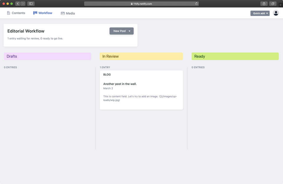 On the Workflow tab, you can handle the status of your entries, for example, posts. It's a very cool option for content creators and when your content workflow demands for posts to be reviewed before it goes live.